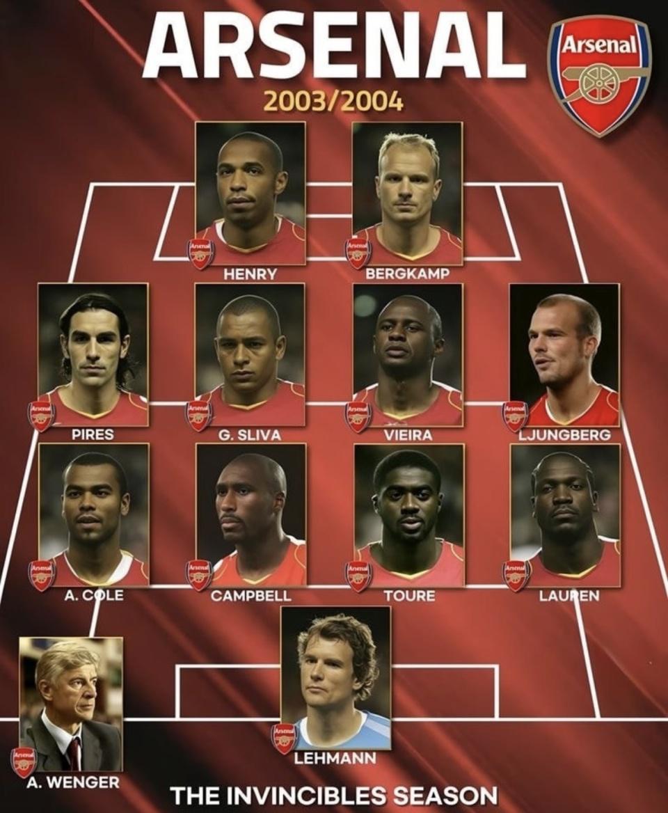 最近外媒整理了阿森纳2003/2004“不败赛季”首发阵容,锋线是亨利搭档博格坎普,中场由维埃拉和吉尔贝托·席尔瓦坐镇,两翼是皮雷、永贝里,后防线上还有科尔、坎贝尔、图雷、劳伦,再加上莱曼把门。放回那个赛季的真实对抗里看:38轮不败、12场平局分别被哪些对手拿走、90分夺冠且领先第二名11分,这套阵容在英超历史里到底能排到什么位置?